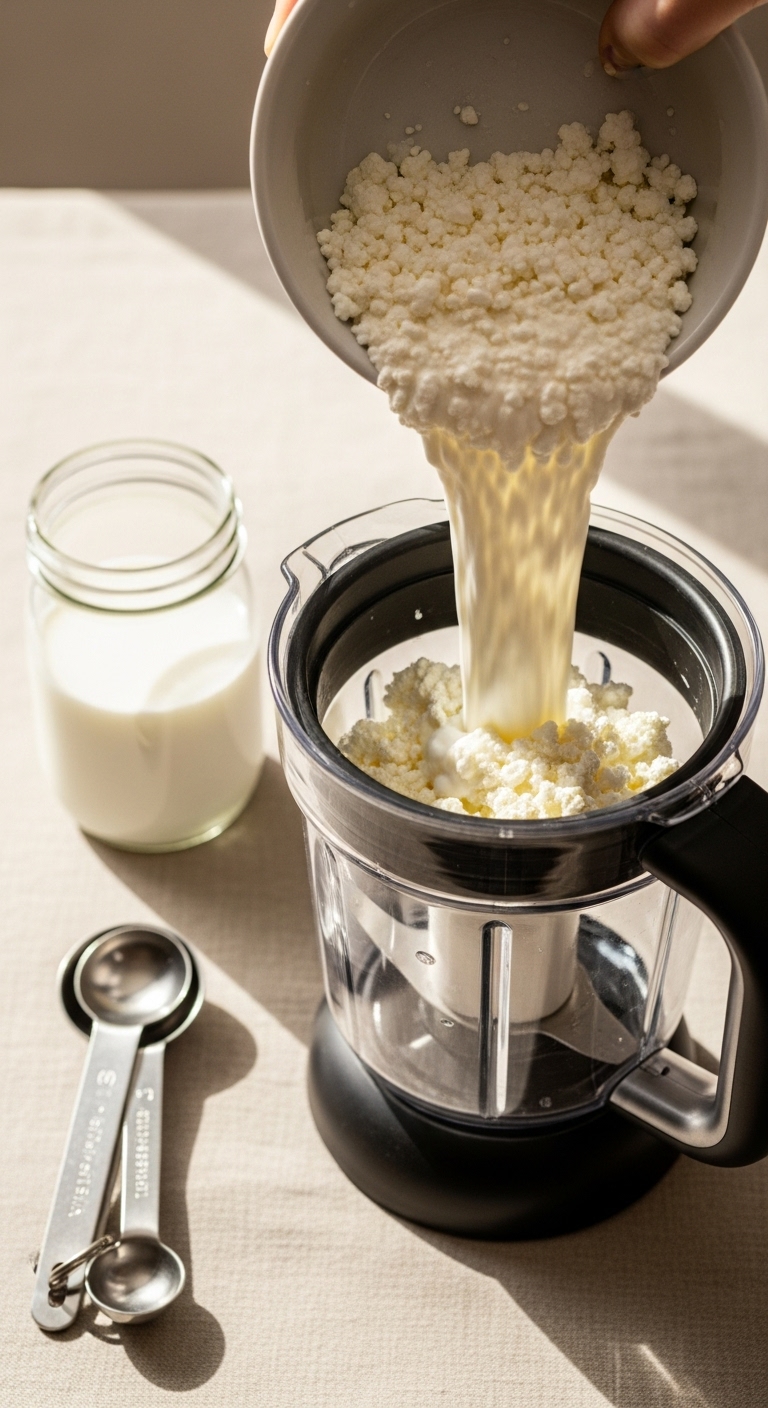 - Smooth the cottage cheese: place 1 cup cottage cheese in a blender and pulse until almost smooth (15–20 seconds). This prevents small curds in the cookie dough and yields a tender crumb.