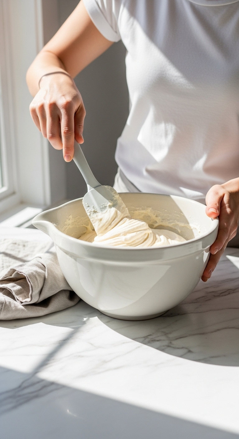 - Whisk eggs and sugar for 2–3 minutes until pale and slightly thickened. This adds lift without needing heavy creaming.