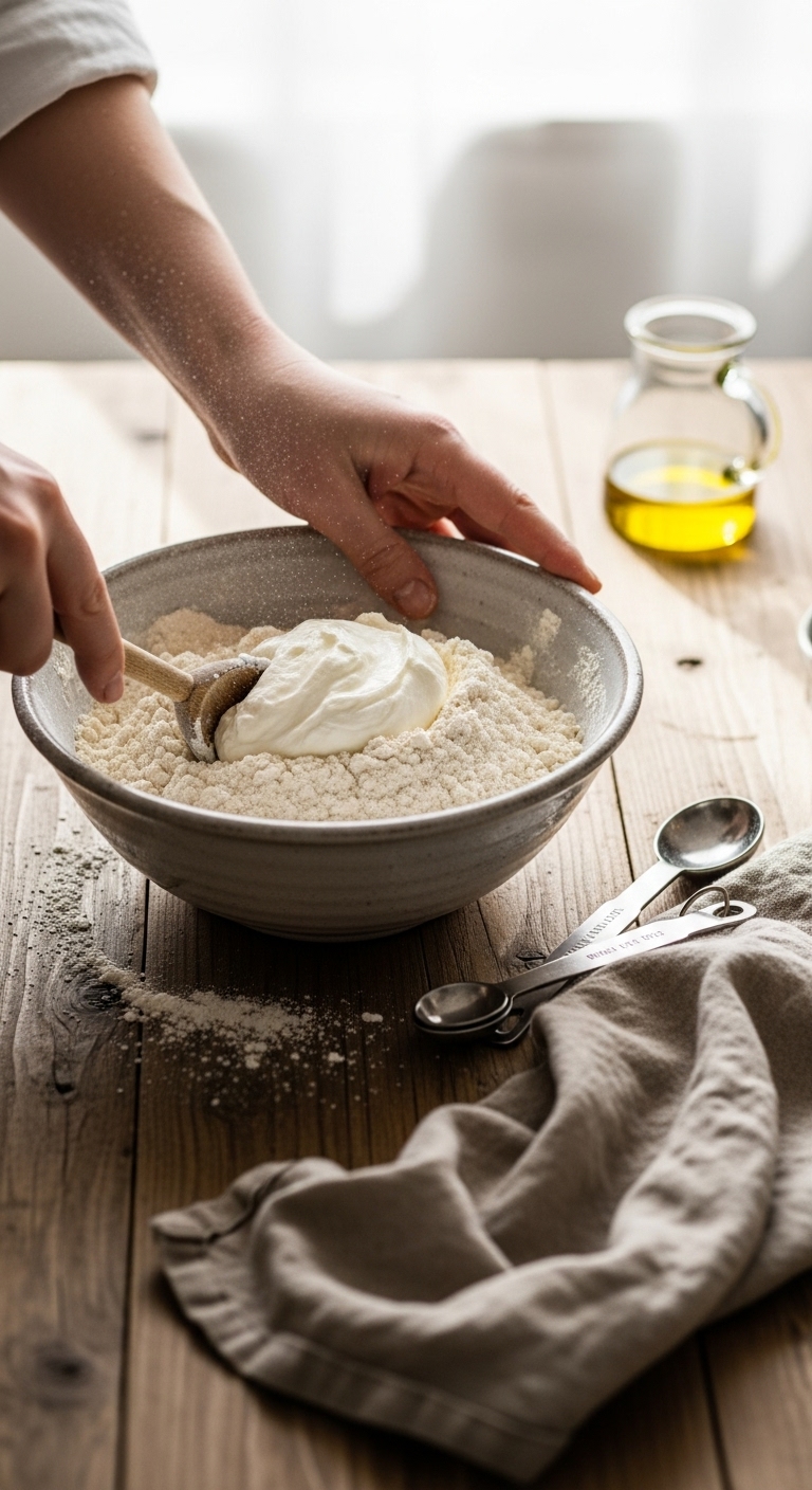 - Add 1 cup Greek yogurt and fold with a spoon until a shaggy dough forms.