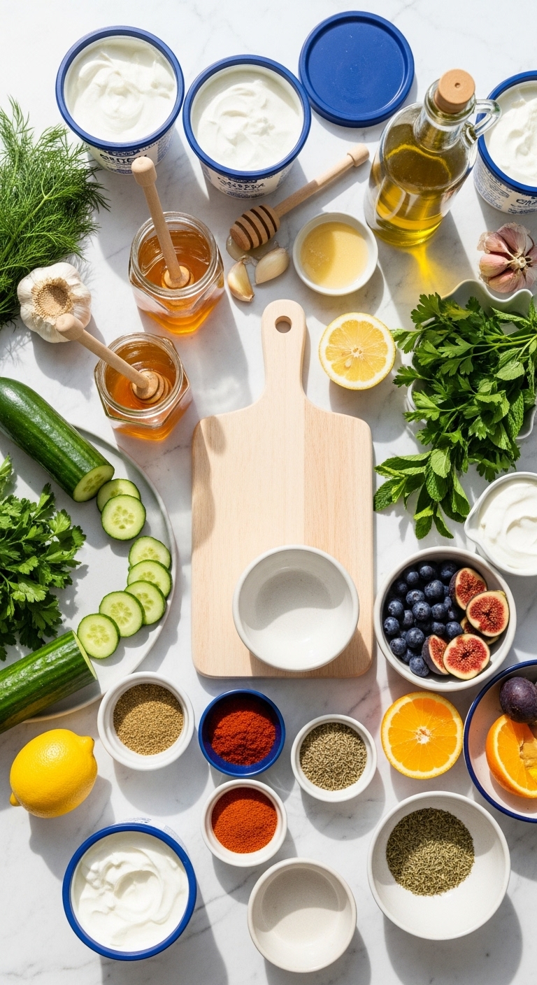 Start with plain Greek yogurt — full-fat for richness, low-fat for lighter texture. Aim for 1–2 cups per recipe depending on servings. Stock simple pantry staples so you can switch between sweet and savory fast.