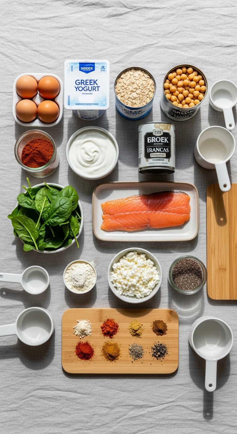 Gather simple, high-protein ingredients that store well. Mix and match to hit about 20–30 g protein per serving.