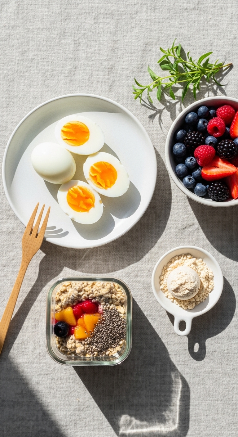- Mix overnight oats: 1/4 cup oats, 3/4 cup unsweetened almond milk, 1/2 cup Greek yogurt, 1 tbsp chia, chill 6–8 hours.