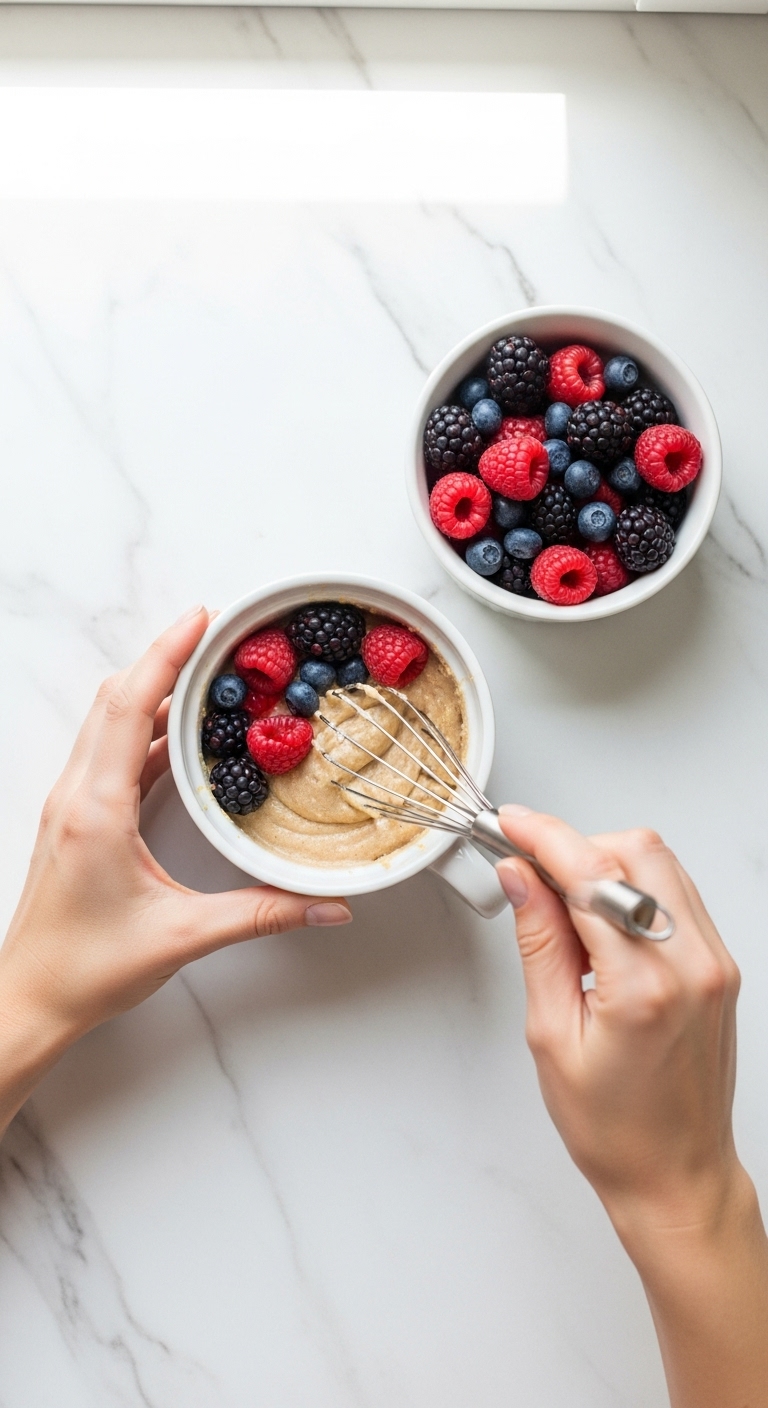 Follow this base recipe for a quick protein mug cake. It’s scalable and adaptable.