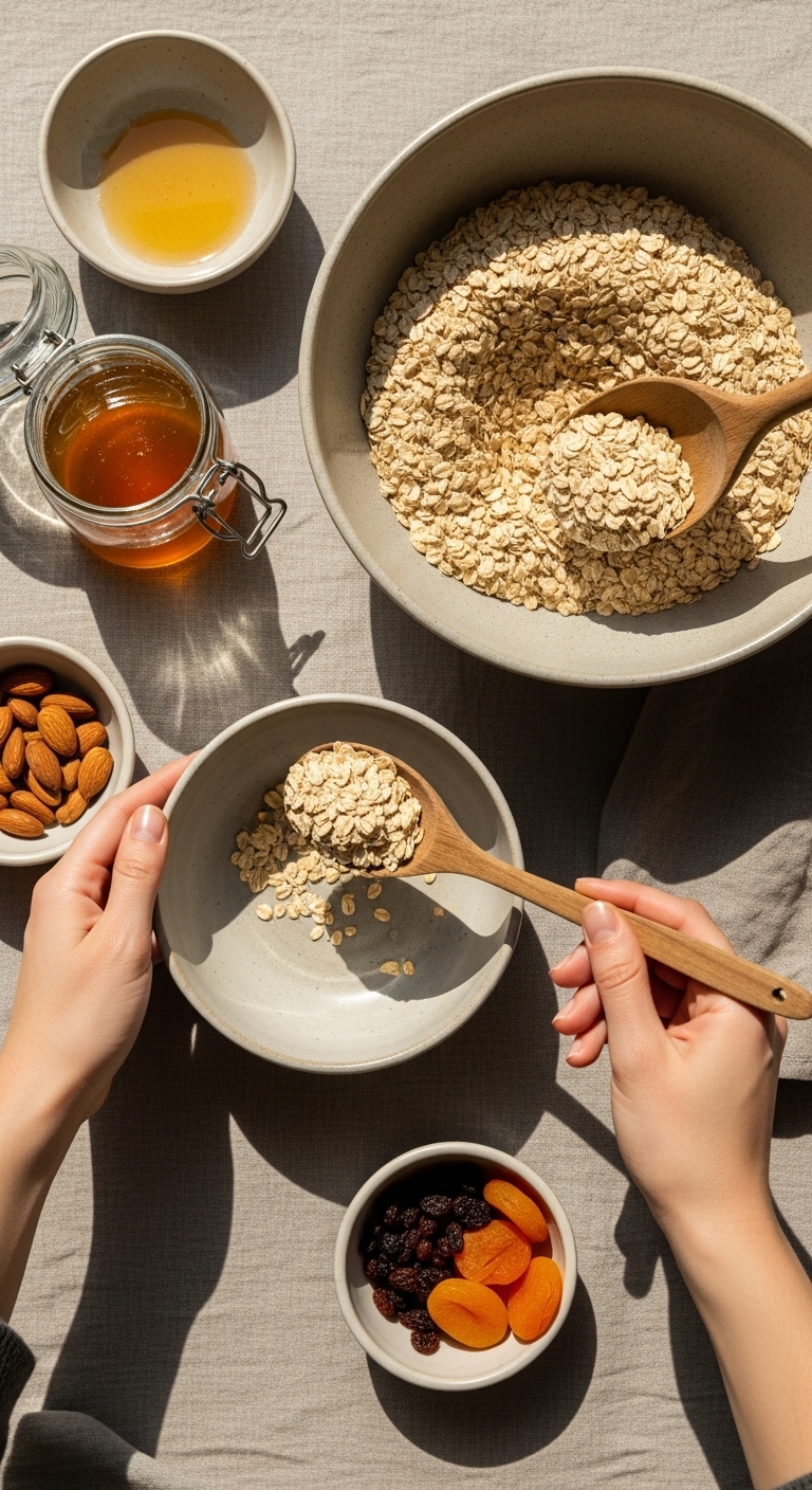 - Pinch-test: press a tablespoon of mix between fingers. If it holds, you’re ready. If crumbly, add 1 tbsp nut butter or honey. If too sticky, add 1–2 tbsp oats or protein powder.