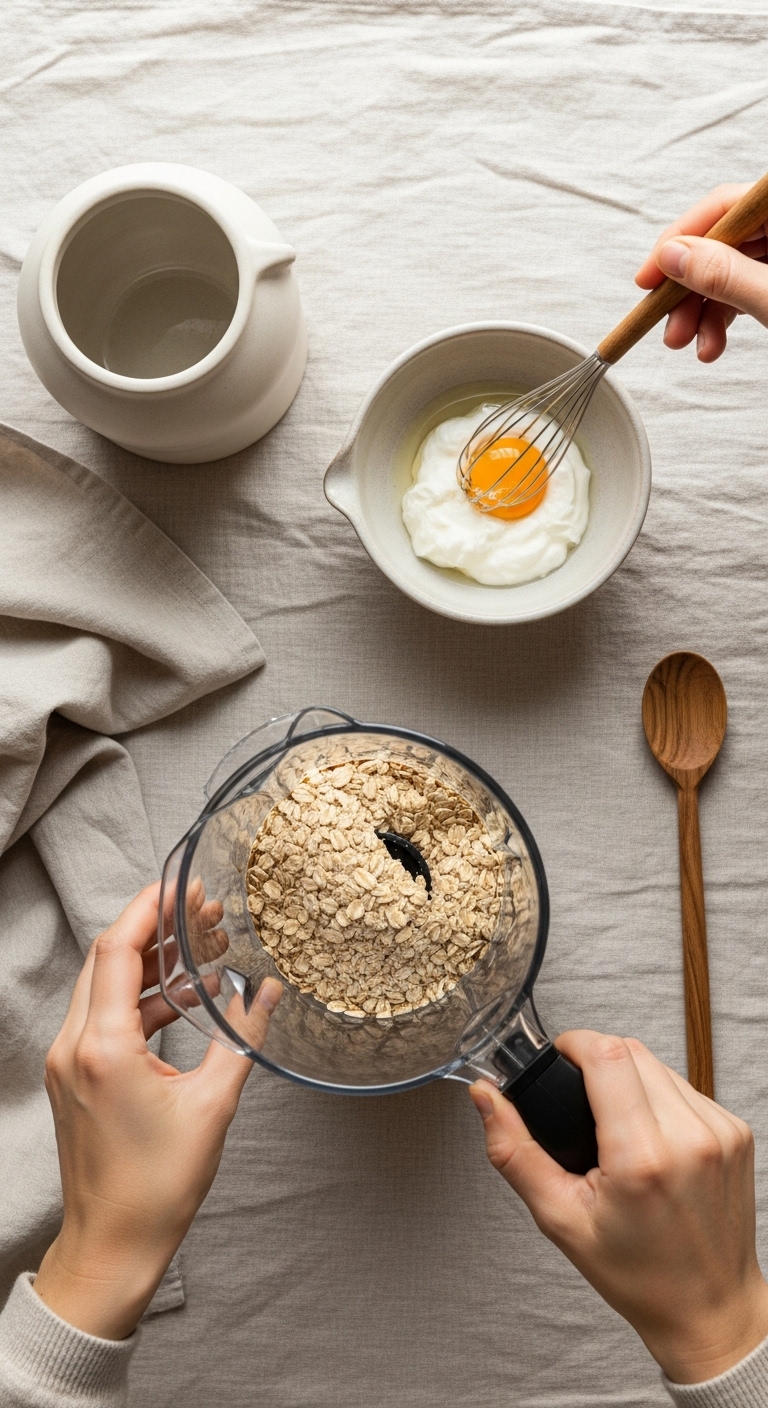 - Make oat flour: pulse rolled oats in a blender for 20–30 seconds.