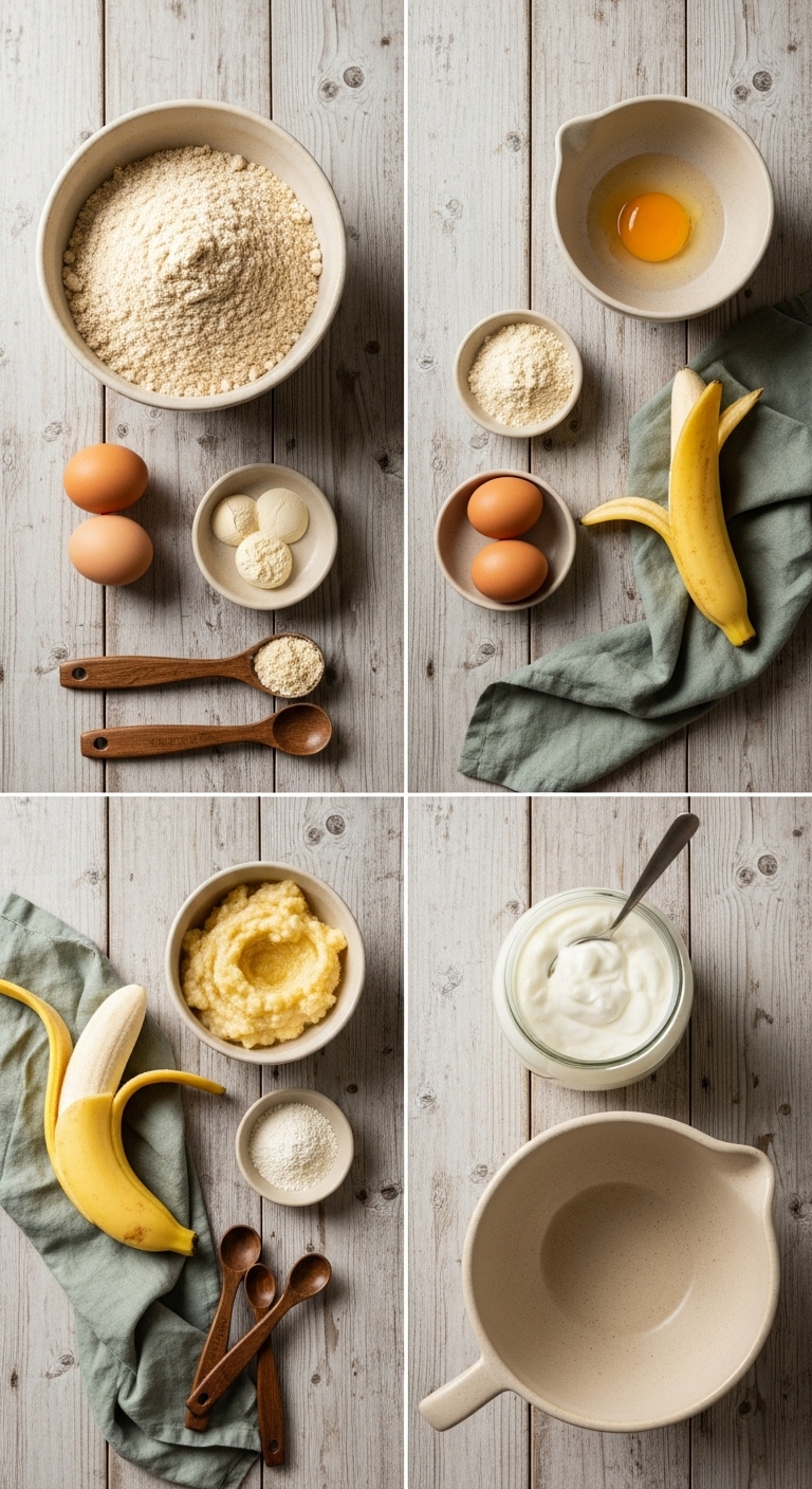 - In a separate bowl, combine wet ingredients: eggs, yogurt, mashed banana, oil, and milk.