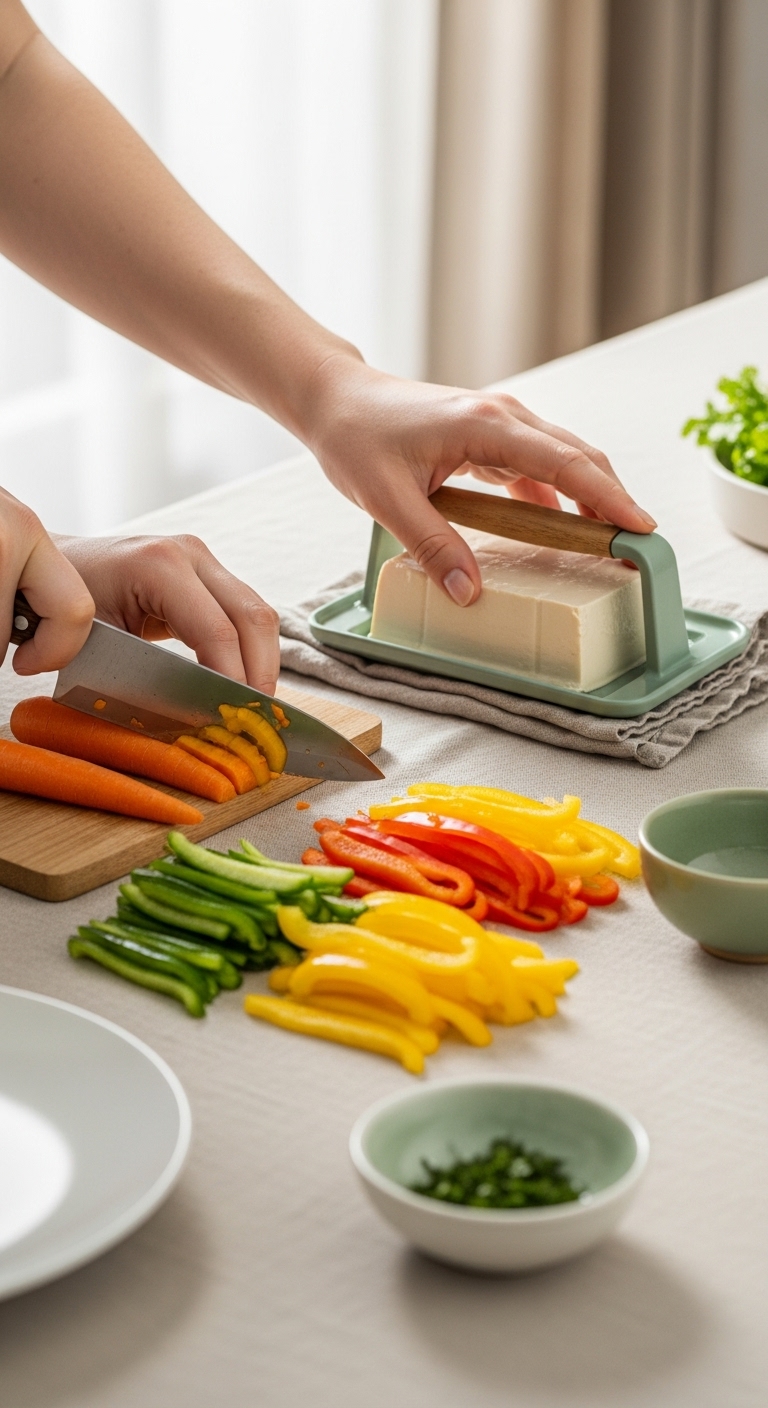 - Sear tofu in 1 tbsp oil 3–4 minutes per side until golden.