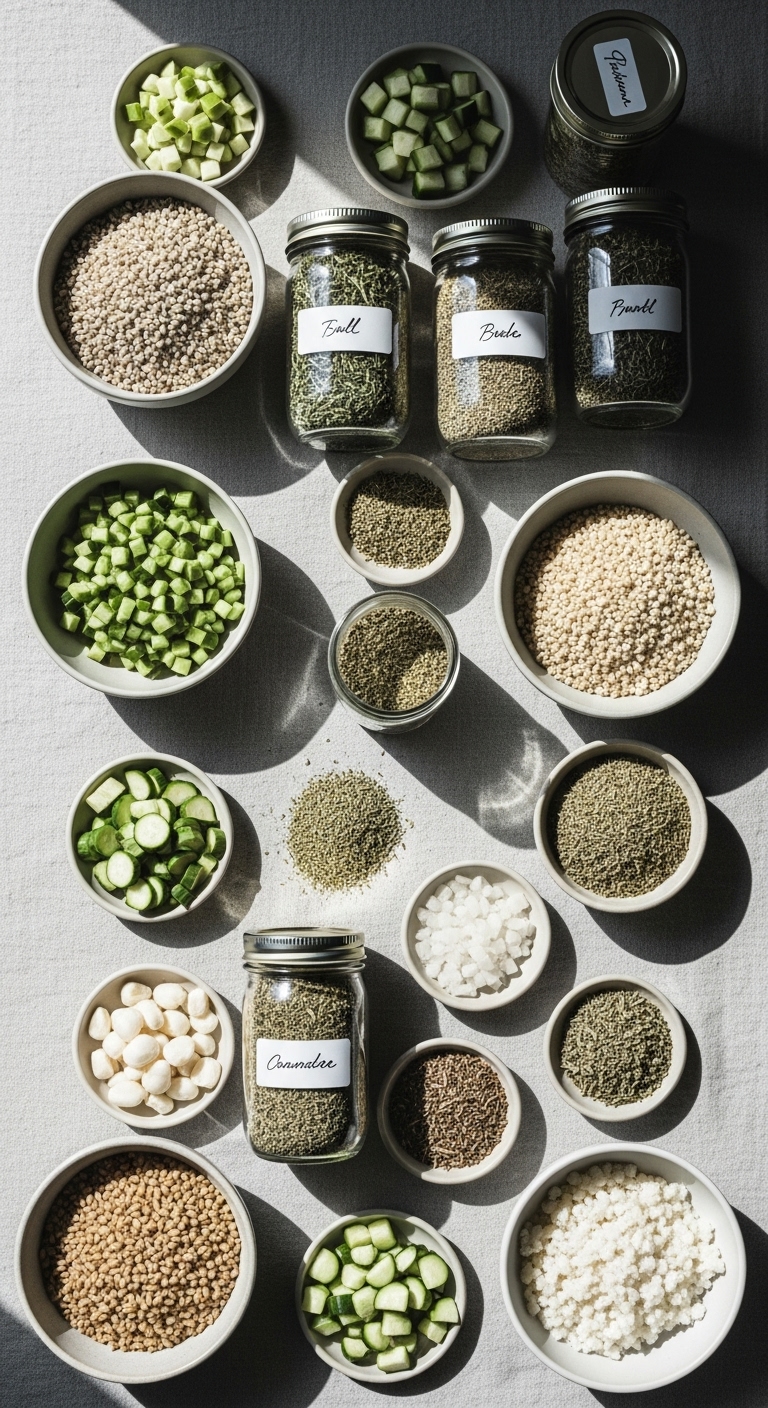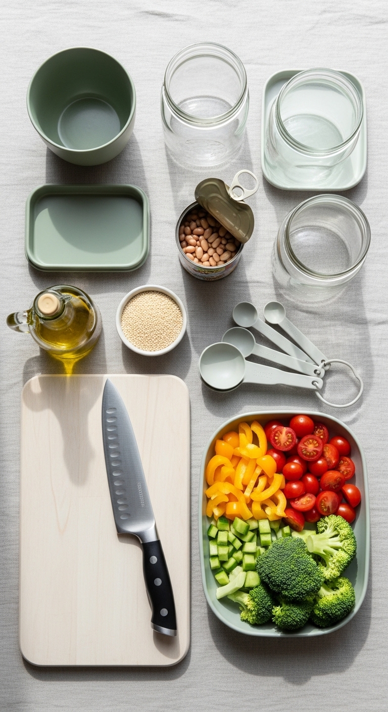 - Staples: 2 cups dry grains (rice/quinoa), 3 cans beans, olive oil, vinegar, basic spices