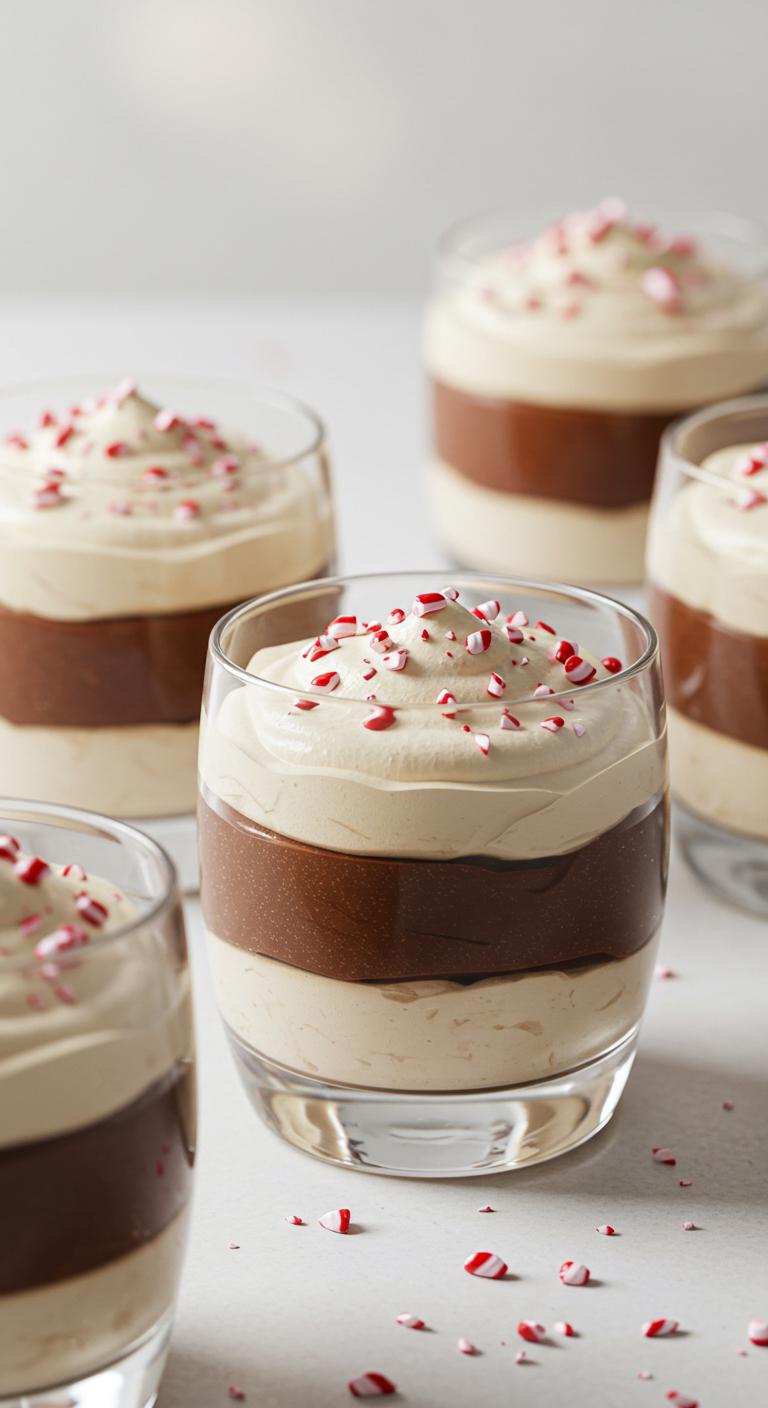 - Layer chocolate mousse, whipped cream, and chopped peppermint bark in cups.