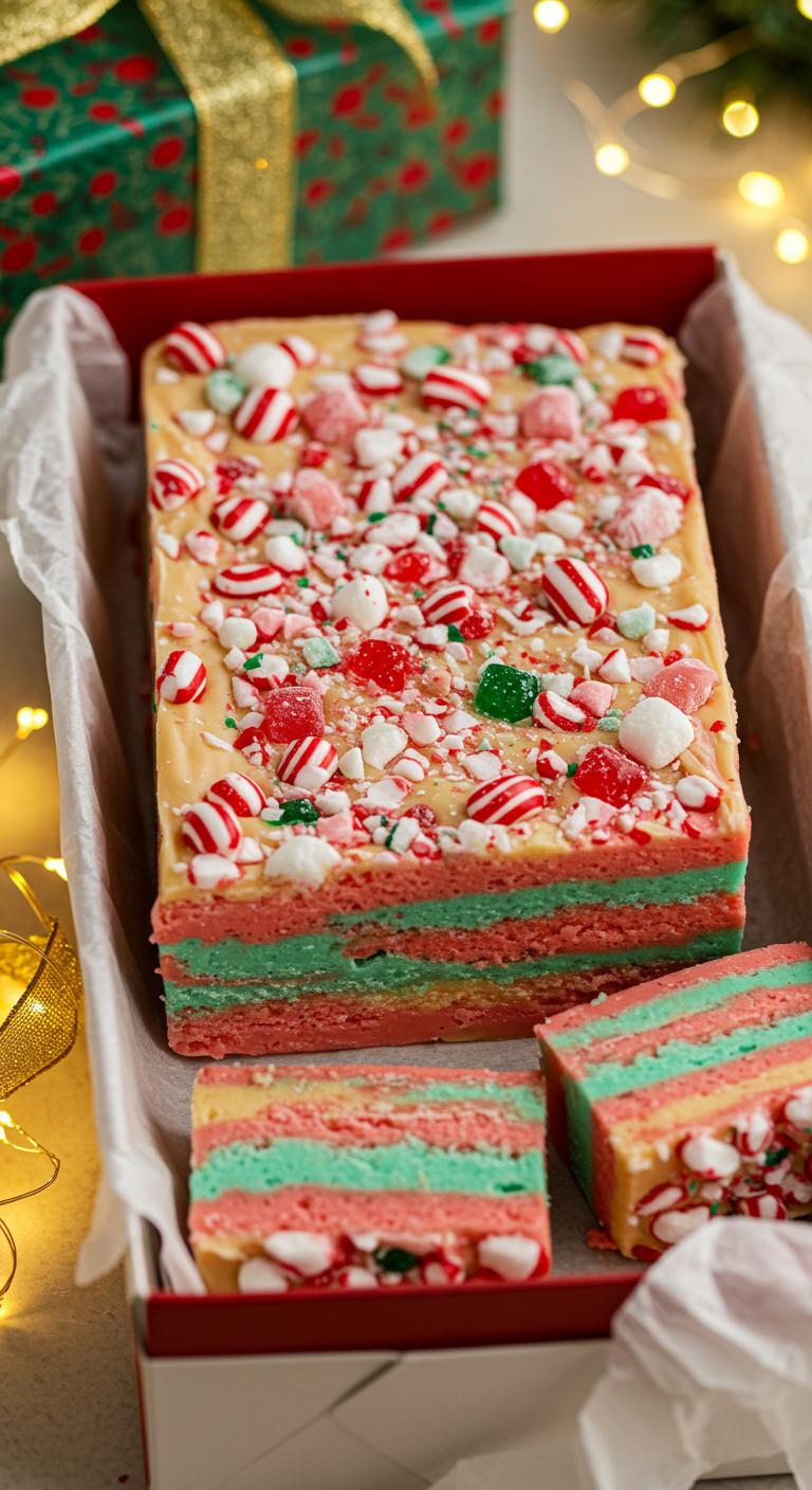 - Pour into a greased pan, top with remaining candy canes, and refrigerate until set.