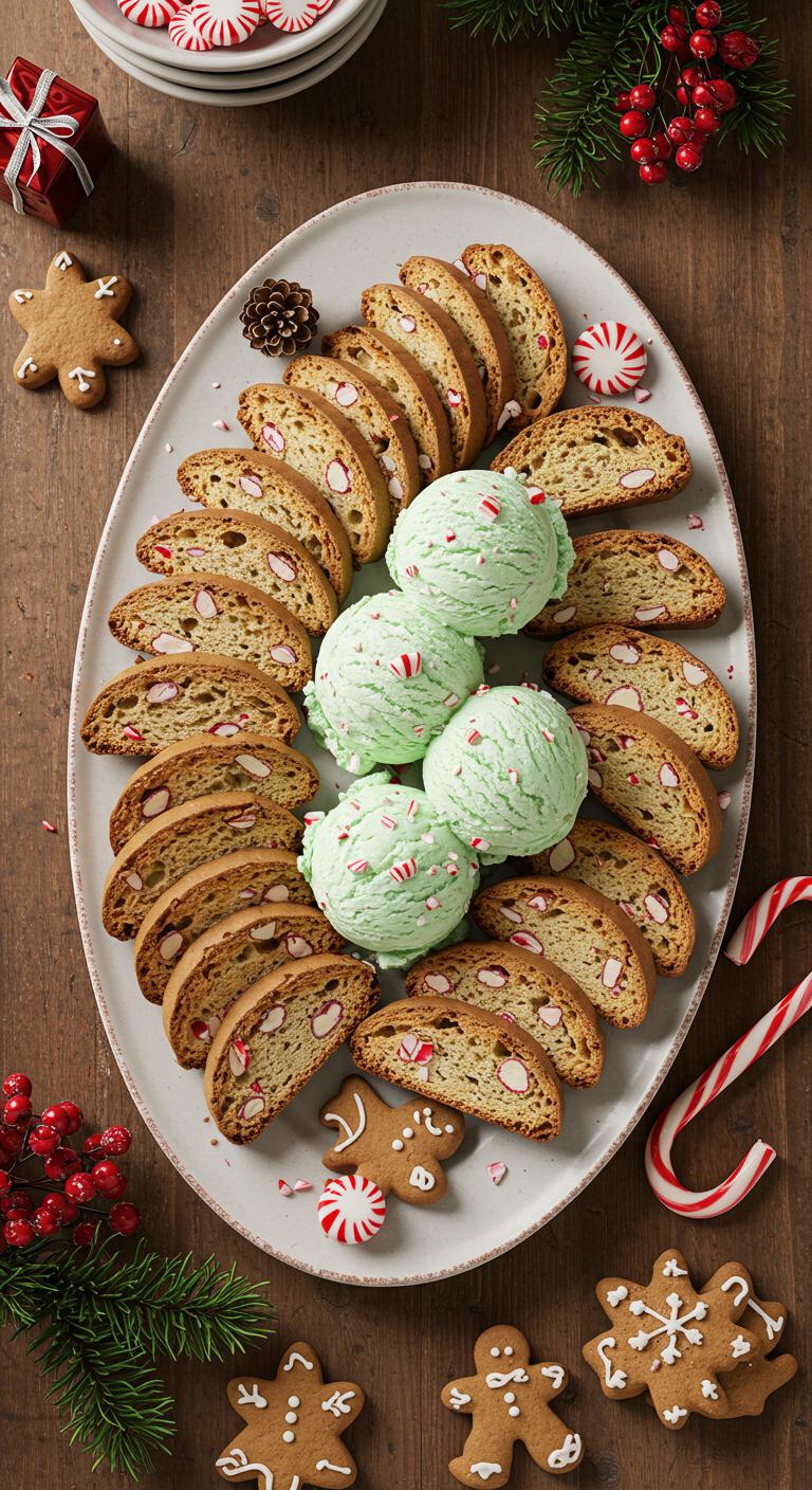 - Scoop peppermint ice cream onto one biscotti and top with another.