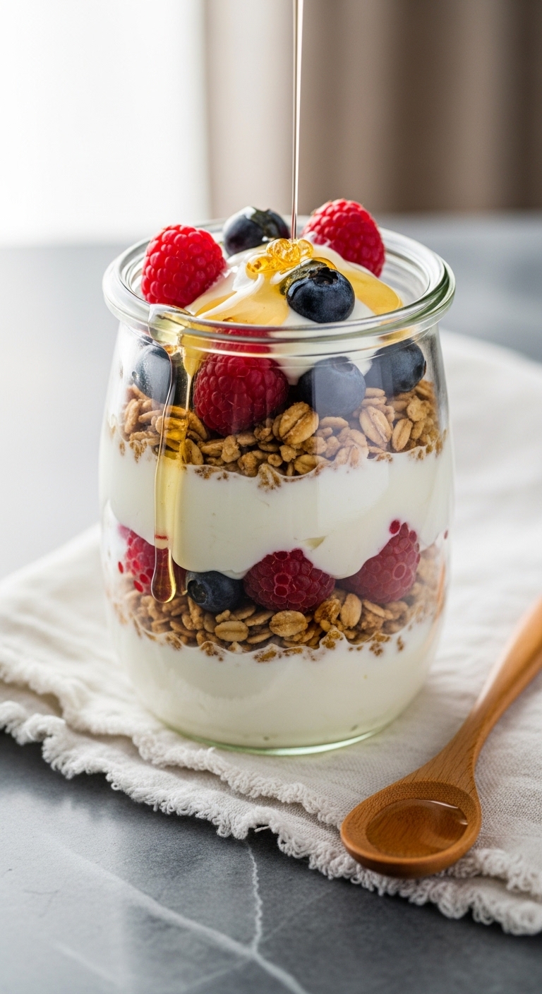 Serve in clear jars for a pretty, layered look. Garnish with a mint sprig and extra lemon zest. Pair with a small latte or green tea. Store airtight in the fridge up to 24 hours — granola stays crunchiest if added just before eating. Make ahead for busy mornings by prepping layers the night before, keeping granola separately.