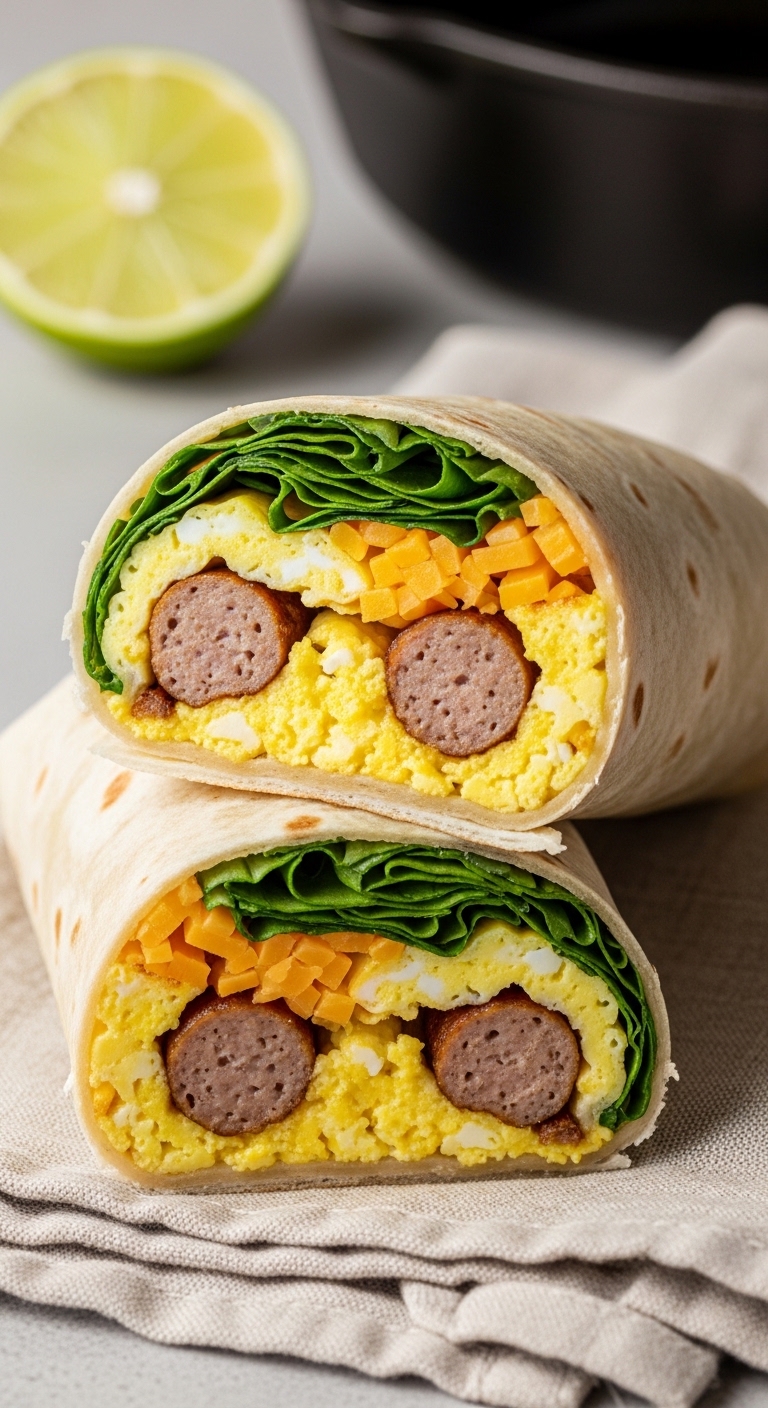 Serve with fresh salsa and lime wedges. Add sliced avocado or hot sauce for creaminess and heat. Wrap leftovers in foil and refrigerate up to 3 days. To reheat, microwave for 60–90 seconds or warm in a skillet until heated through. Make extra filling and assemble burritos the night before for a quick morning grab.