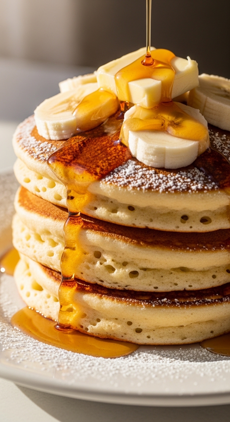 Stack pancakes and add a pat of butter and extra syrup. Sprinkle with chopped walnuts or toasted coconut. Serve with Greek yogurt or a side of turkey bacon for extra protein. Store leftovers in fridge up to 2 days and reheat in skillet for best texture. Batter keeps in fridge 24 hours if you want to pre-mix.