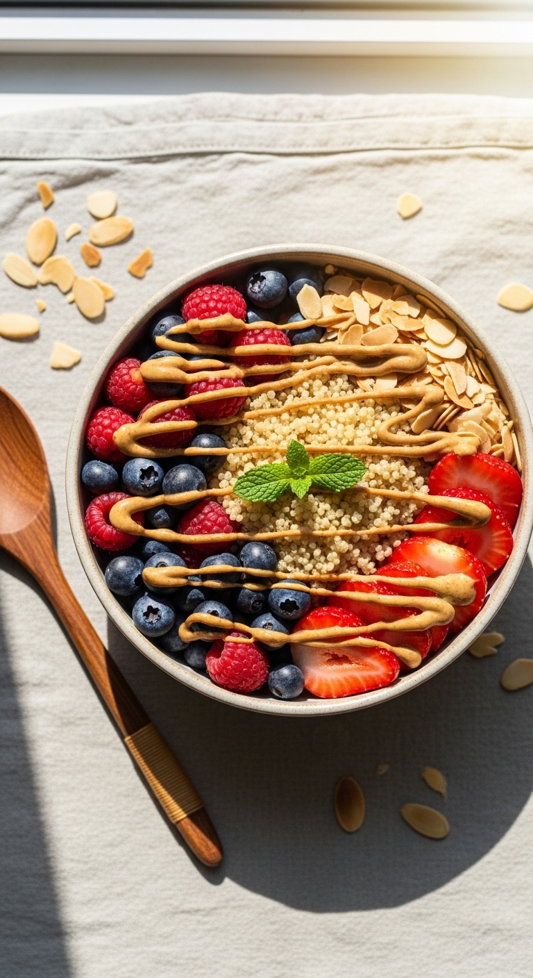 This bowl uses fluffy quinoa for a nutty base and almond butter for richness. It’s a warm, hearty breakfast with pops of berry tartness. You’ll love the light chew of quinoa and crunchy almonds. The aroma is toasty and nut-forward.