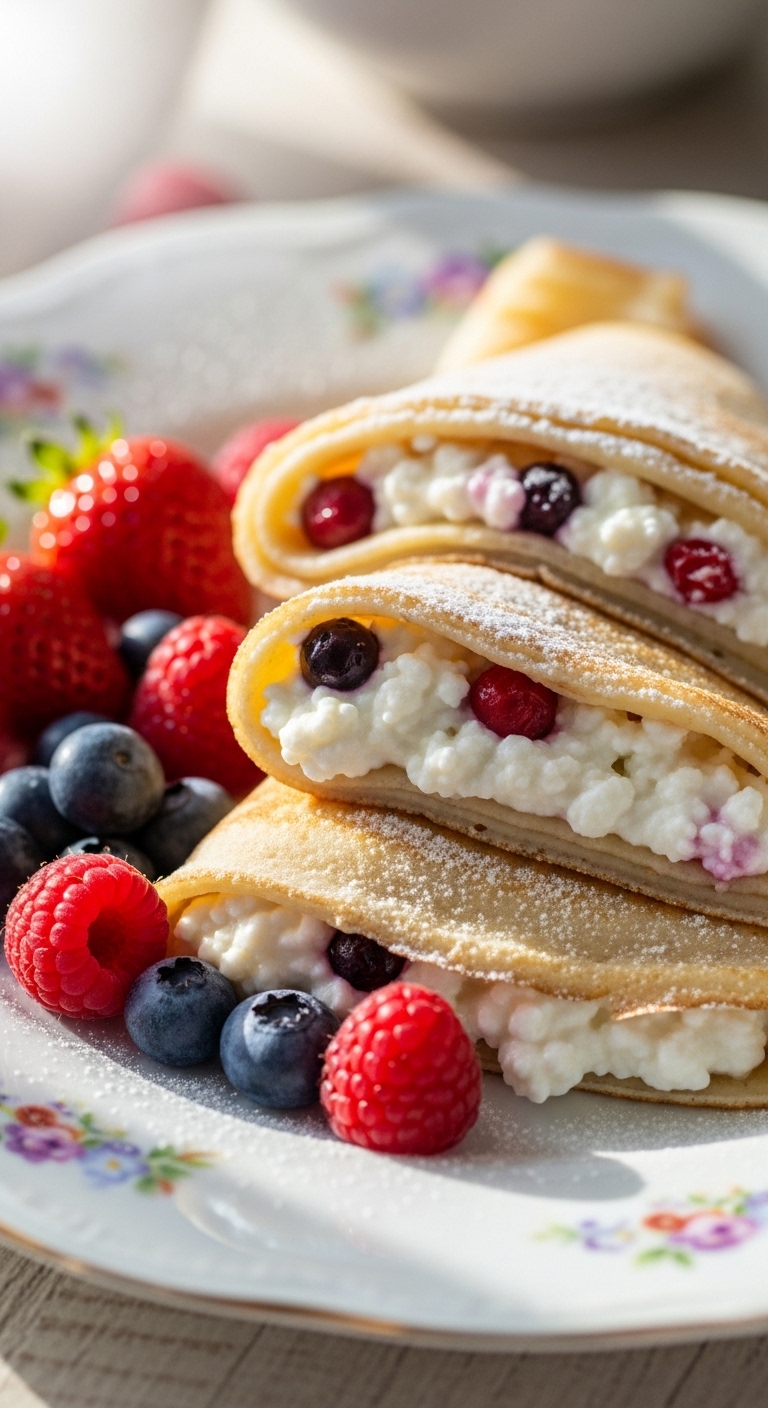 - Spread cottage cheese mixture on each crepe, add berries, fold, and dust with powdered sugar.