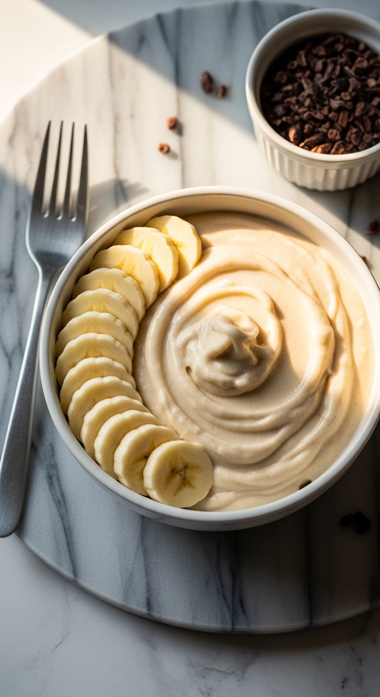 This banana protein "nice" cream is a creamy, dairy-free frozen dessert. It uses frozen bananas and protein powder for sweet, soft-serve texture. Expect a naturally sweet banana flavor with a velvety mouthfeel.