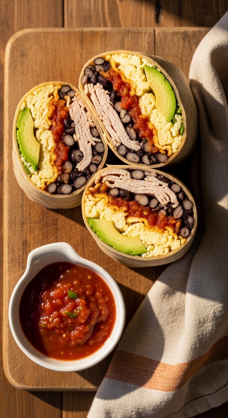 This wrap blends lean turkey, tangy feta, and fresh spinach into a handheld meal. Egg and turkey provide steady protein and savory depth. A portable protein packed breakfast that’s quick to assemble. You’ll love the savory-salty notes and soft tortilla bite. Steam from the warm filling smells inviting.