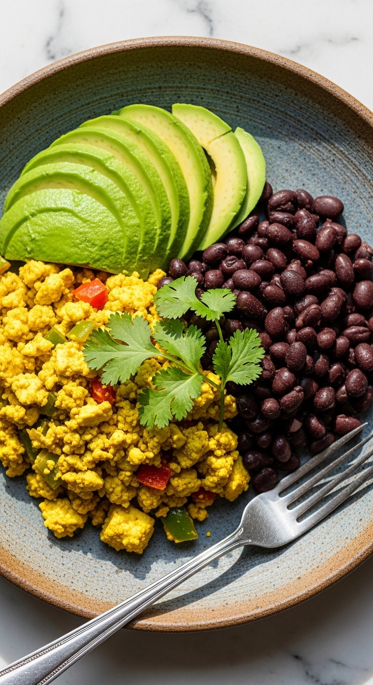 This tofu scramble mimics scrambled eggs with a hearty, savory profile. Crumbled tofu soaks up turmeric and spices, while black beans add protein and texture. It's a vegan protein packed breakfast that satisfies. You’ll love the smoky spice and creamy avocado contrast. The smell of cumin and garlic is mouthwatering.