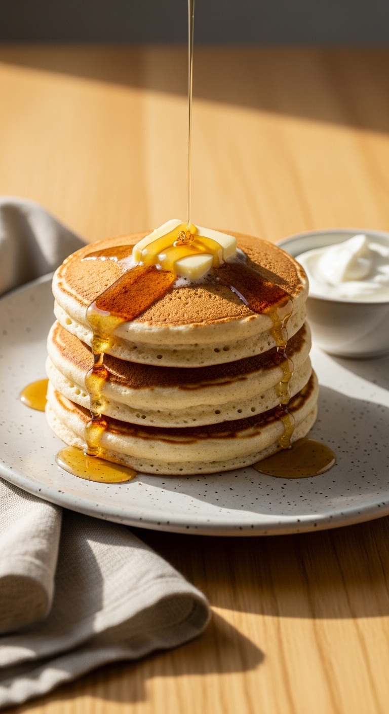 Serve stacked with a pat of butter and a generous drizzle of pure maple syrup. Add fresh berries and a dollop of Greek yogurt for tang. Pair with black coffee or a green smoothie for a protein-packed breakfast. Store leftovers in an airtight container in the fridge for up to 3 days. Reheat in a toaster or skillet for best texture. Batter can be made ahead and refrigerated for 12 hours.