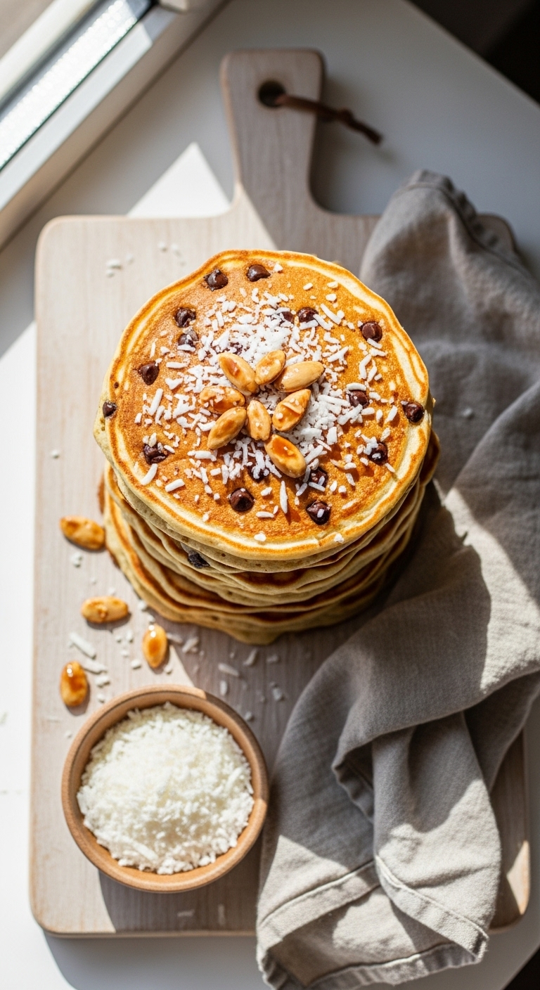 Top with extra shredded coconut, toasted almonds, and a drizzle of dark chocolate sauce or coconut yogurt. Pair with black tea or a tropical fruit smoothie. Store in fridge for 3 days or freeze. For make-ahead, cook and freeze in stacks with parchment between layers.