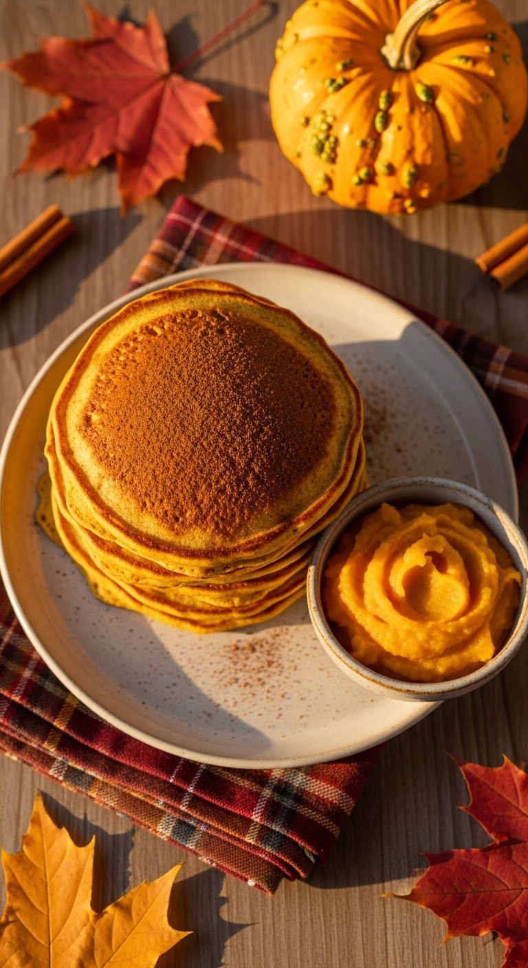 Top with chopped pecans, a drizzle of maple syrup, and a spoonful of Greek yogurt. Pair with spiced tea or a pumpkin latte. Store refrigerated for 3 days or freeze in stacks. Make-ahead: mash sweet potato and mix batter the night before for quick morning cooking.