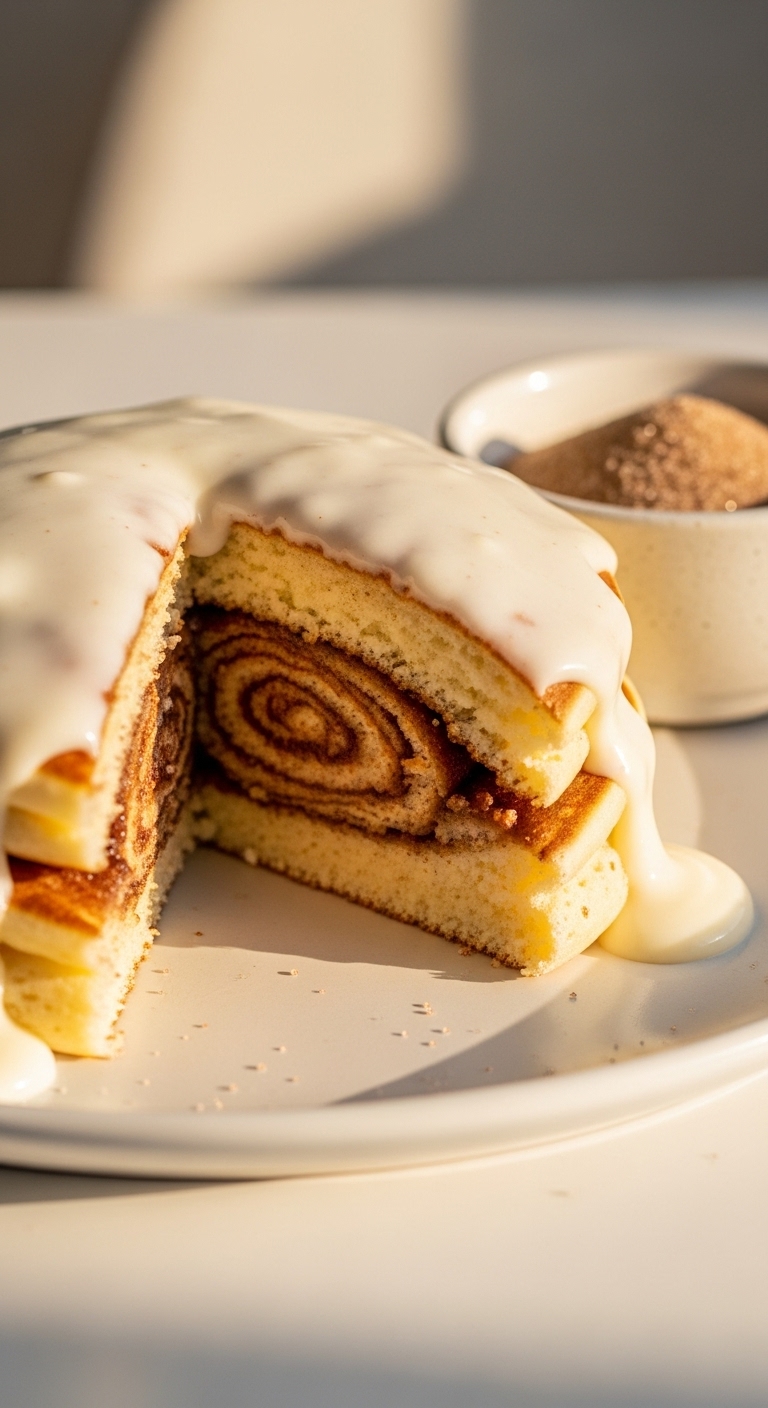 Stack pancakes and pour cream cheese glaze generously. Sprinkle extra cinnamon sugar and add toasted walnuts for crunch. Serve with a latte or chai. Store in fridge for 2 days (glaze separately). Reheat gently; add fresh glaze after warming.