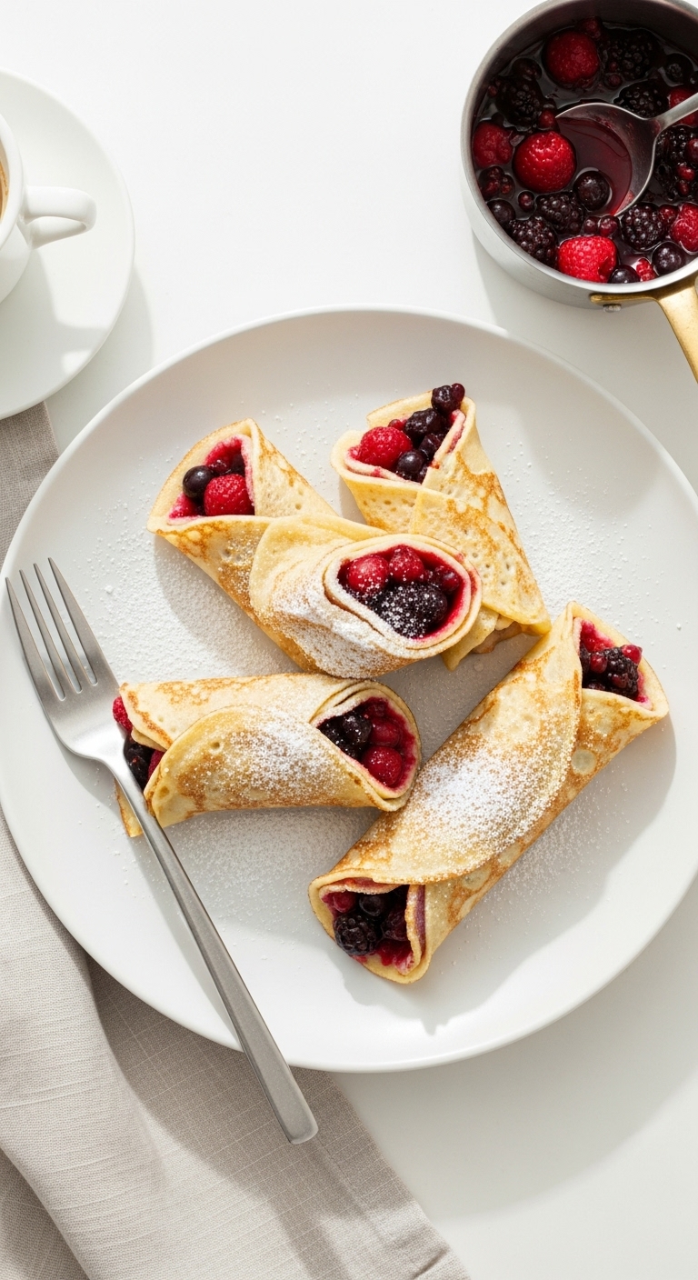 Roll crepes with fresh berries and ricotta or with smoked salmon and dill for savory. Dust with powdered sugar or drizzle honey for sweet versions. Store cooled crepes in fridge up to 2 days; reheat in a skillet. Batter can rest overnight in the fridge for convenience.