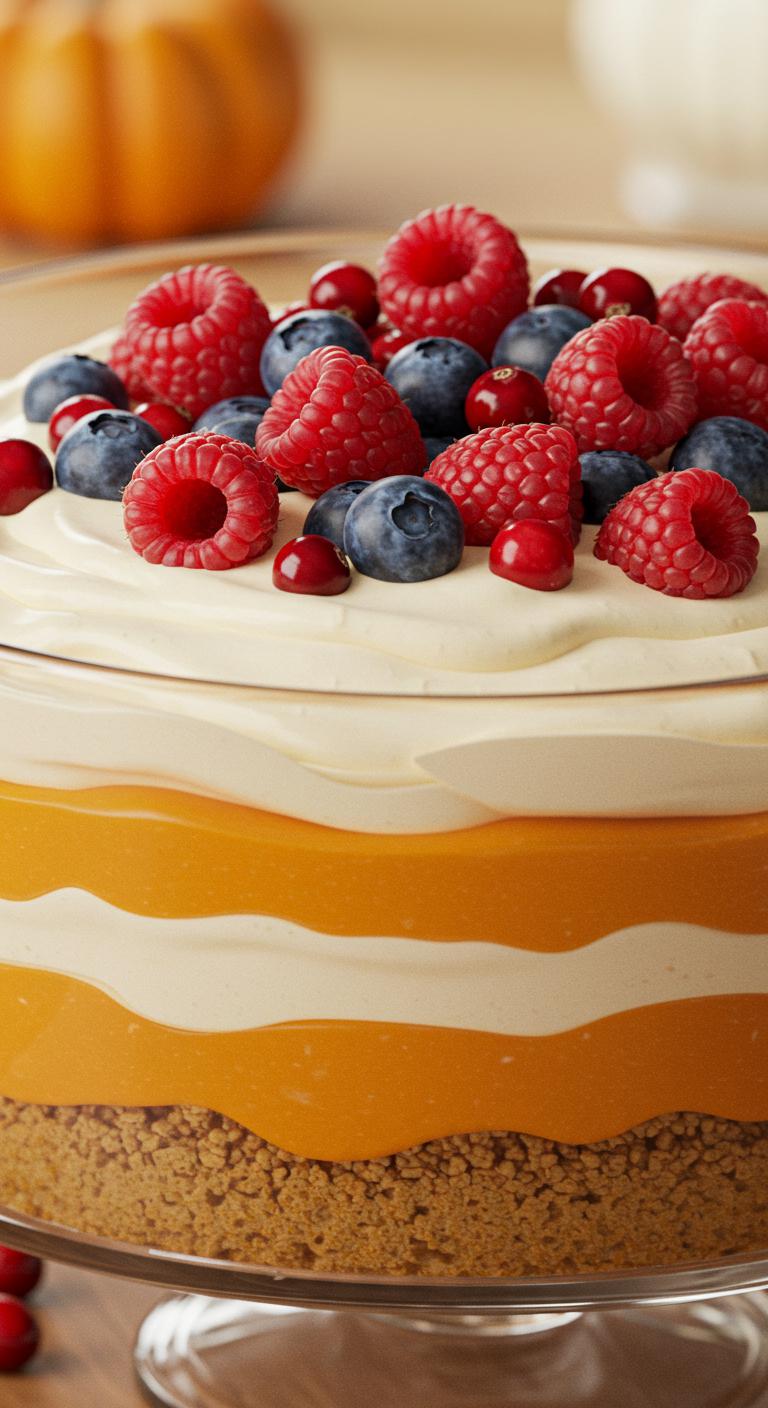 - Layer cake cubes, cheesecake mixture, and whipped cream in a trifle dish.