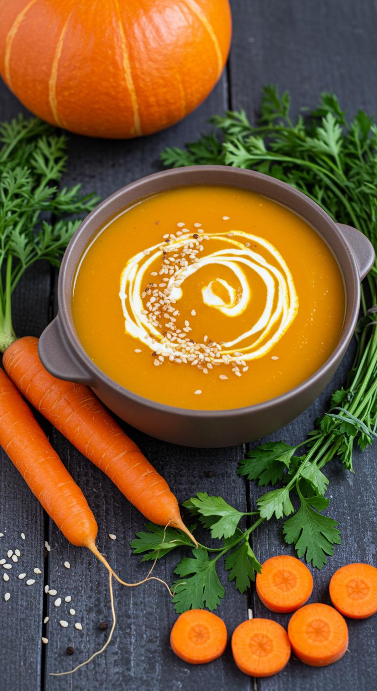 This vibrant soup combines the sweetness of carrots with pumpkin’s creaminess.