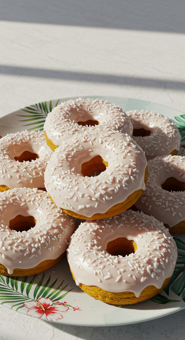 - Fill the donut pan, bake for about 12 minutes, and top with coconut after glazing.