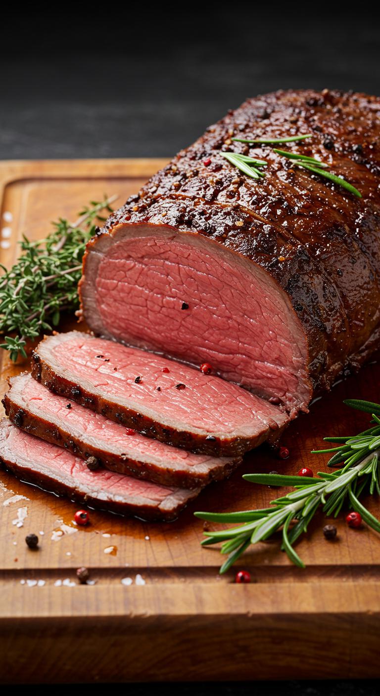 - Roast for about 1.5 hours or until medium-rare; let it rest before slicing.
