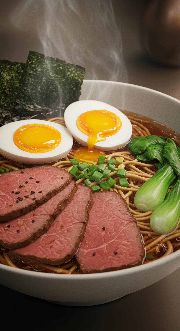 - Heat broth and add sliced beef; serve over noodles, topped with green onions and eggs.