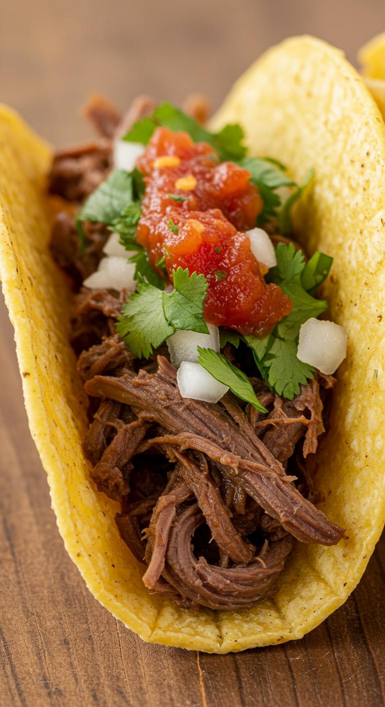 - Place beef, broth, onion, and garlic in a slow cooker; cook on low for 8 hours.