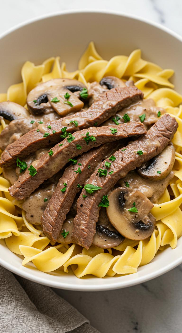 - Sauté mushrooms, then add beef and broth; simmer for 10 minutes.