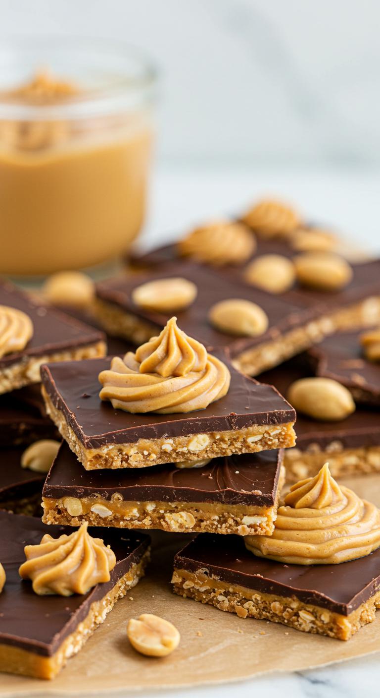 - Melt chocolate and peanut butter, swirl together on top of toffee, and allow to harden.