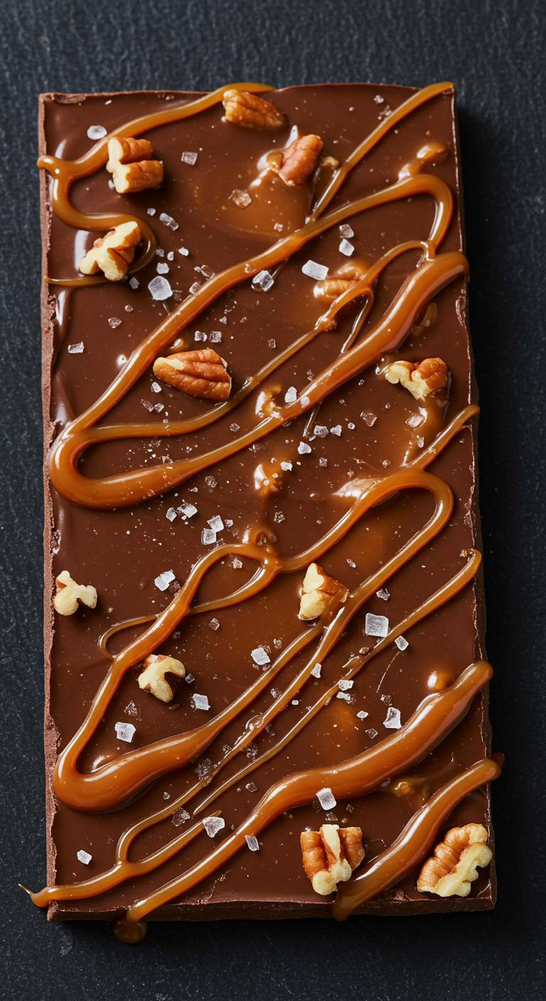 - Melt dark chocolate, spread over toffee, top with pecans, and finish with a sprinkle of sea salt.