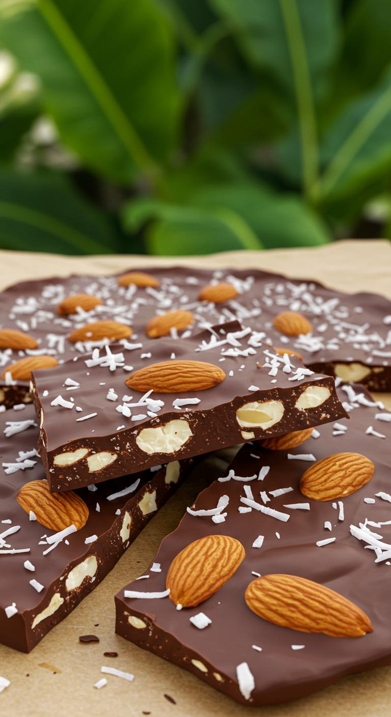 - Sprinkle shredded coconut and whole almonds evenly on top.