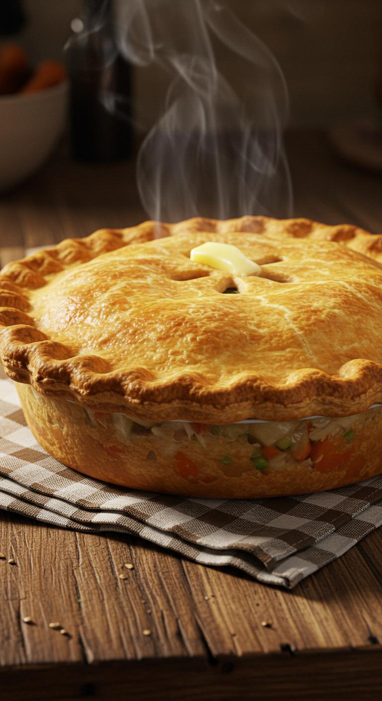 - Mix turkey, veggies, and soup in a pie pan. Cover with crust.