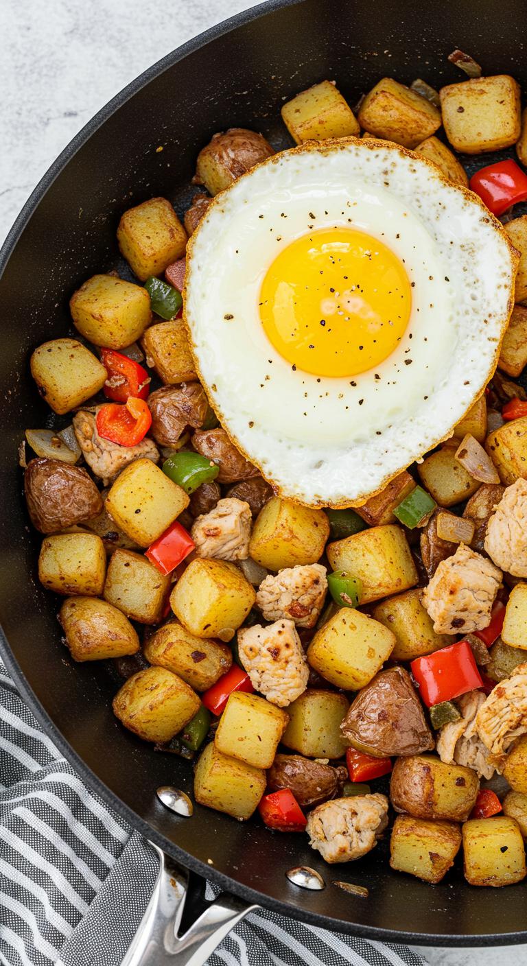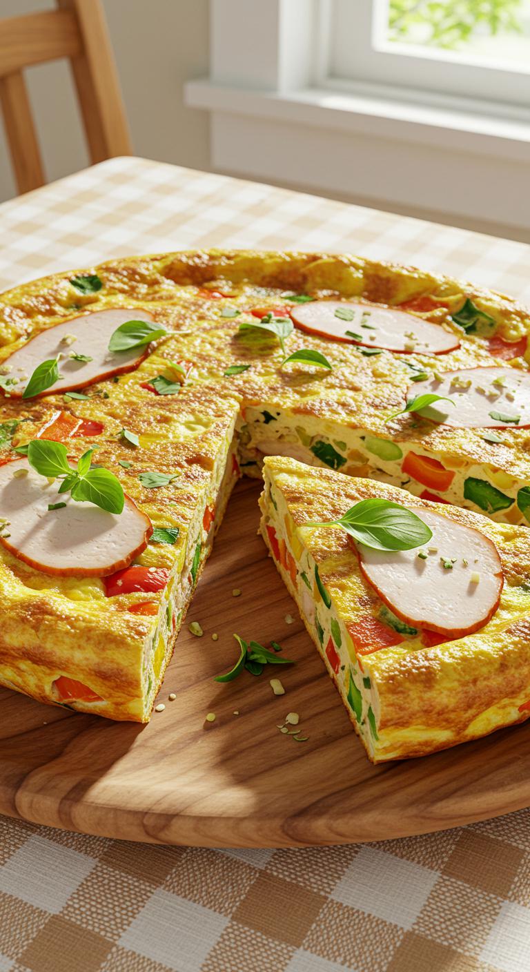 - In a skillet, cook turkey and vegetables until soft, then pour in eggs.