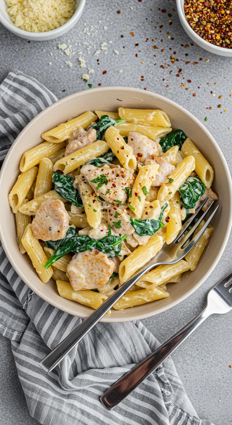 - Drain and return to pot; stir in turkey, spinach, and sauce until warmed.