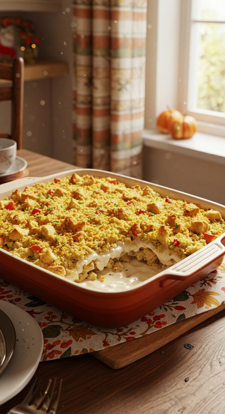 - In a dish, layer turkey and stuffing. Mix soup with broth, pour over, and top with cheese.